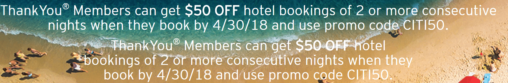 - Citi ThankYou Members can get $50 off hotel bookings of 2 or more consecutive nights when they book by 4/30/18 and use the promo code CITI50