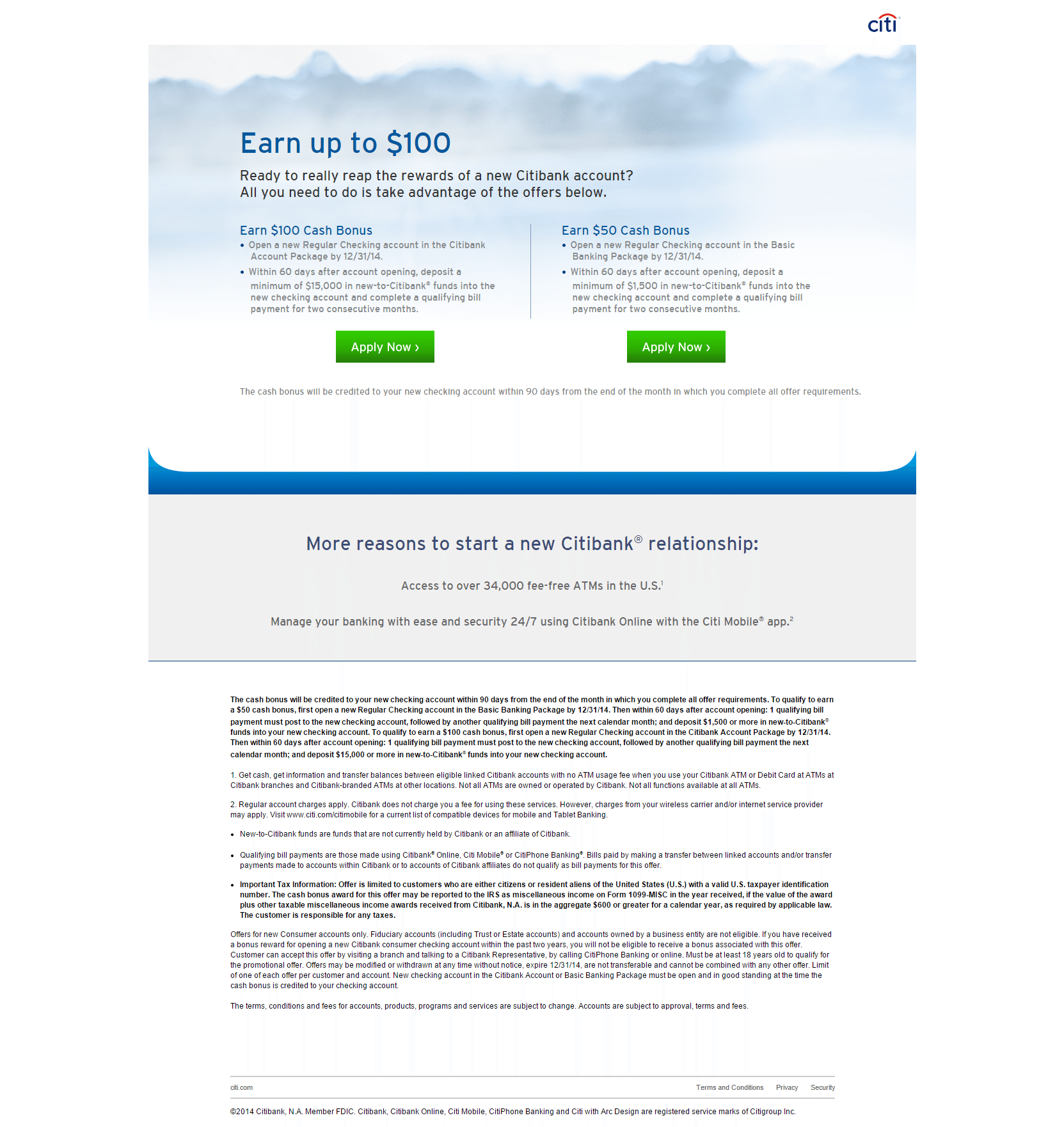 - $100 cash bonus: Open a regular checking account in the Citibank account package and deposit at least $15,000 in new to citibank funds and complete a qualifying bill payment for two consecutive months