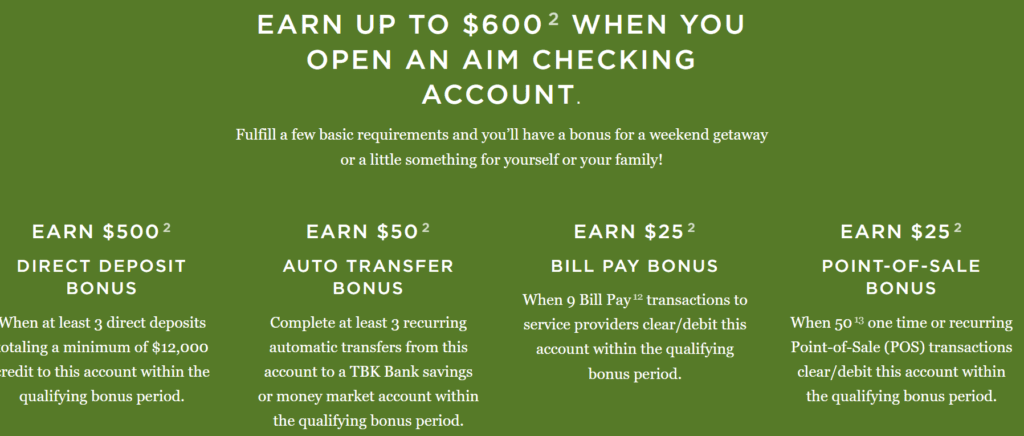 - TBK Bank is offering a bonus of up to $600 when you open a new AIM checking account. Bonus period is March 14, 2022 through June 18, 2022. Bonus is broken down as follows: