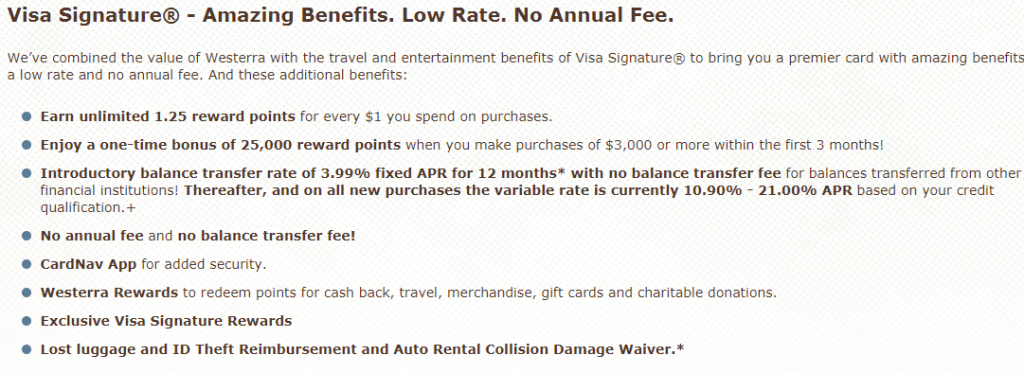 - Westerra Credit Union has a Visa Signature credit card that is currently offering a 25,000 point sign up bonus after $3,000 in spend within the first three months
