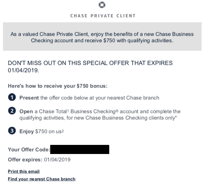 Standard bonus is $300, very rarely we see public bonuses for $500. This seems to have been targeted towards Chase Private Clients, if you didn’t receive the targeted offer it might be worth going in and directly asking for it since CPC are supposed to be high valued customers that are looked after. I wonder if this is part of the roll out of Sapphire Banking as well? Apparently new Chase Private Clients will be offered $1,250 for signing up.We won’t be adding this to our best business checking bonus page as it’s not publicly available.