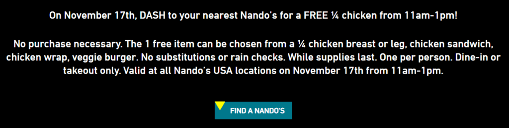 - Valid at all Nando’s USA locations on November 17th from 11am-1pm.