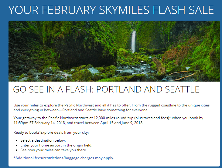 - Delta is having an award sale with round trip flights to SEA & PDX for 12,000 miles + taxes and fees. You must book by 11:59pm ET February 14, 2018, and travel between April 15 and June 9, 2018