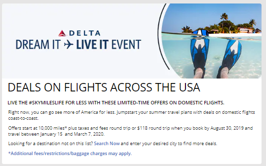 - Delta has a new round of flash sales. This time it’s various domestic destinations on sale from 10,000 miles round trip