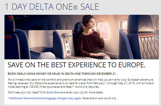 - Delta is offering some flights to Europe in Delta One (business class) for 128,000 miles round trip