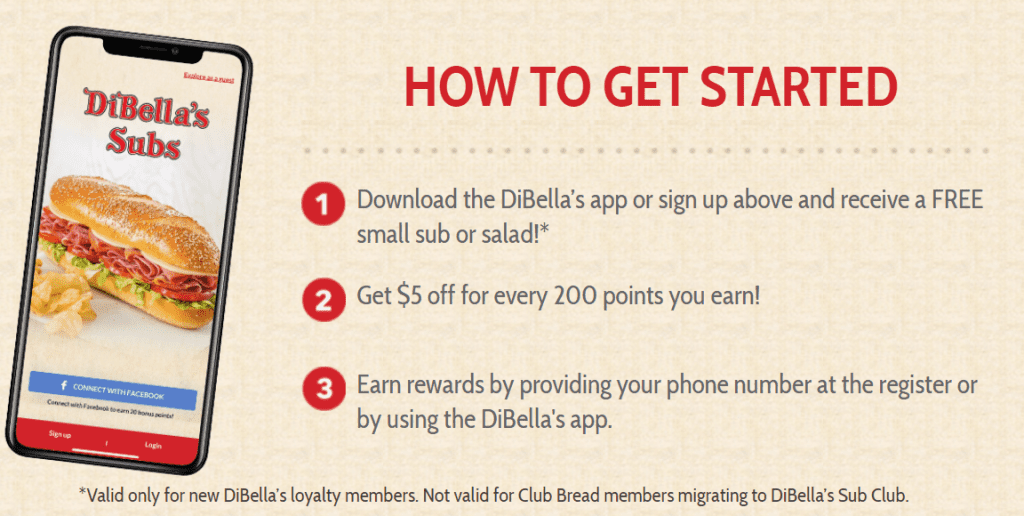 - DiBella’s Subs is offering a free small sub or salad when you sign up for the rewards program or download the app
