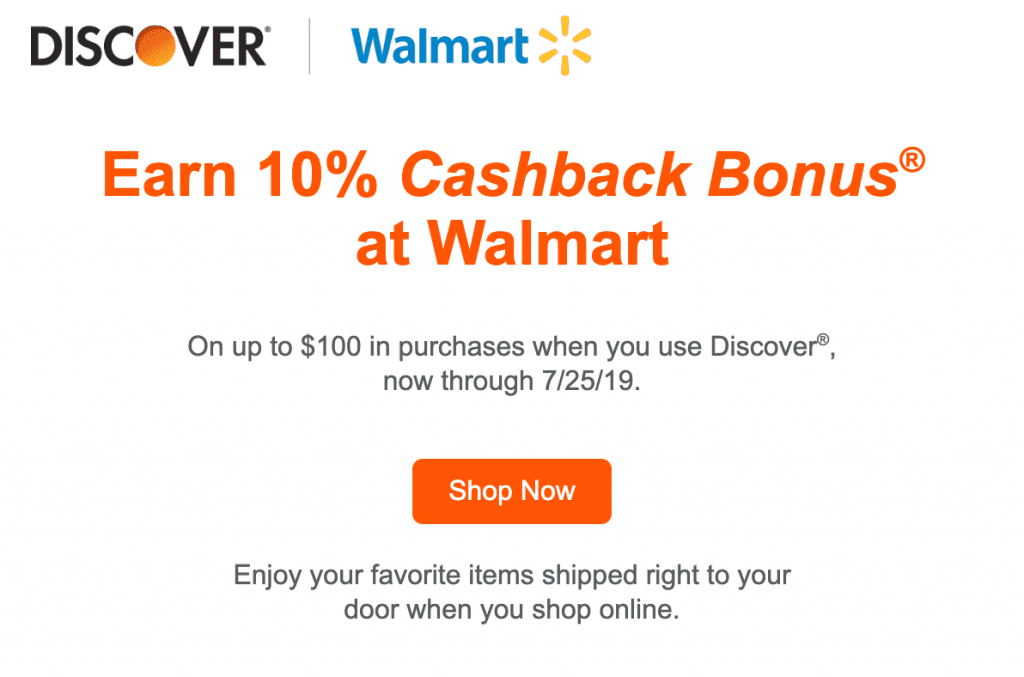- Earn 10% Cashback Bonus on up to $100 in purchases at Walmart up to a maximum of $10 Cashback Bonus during the promotion from 5/30/19 – 7/25/19.