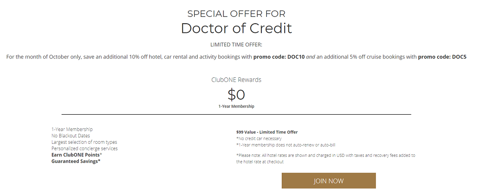 - Club 1 Hotels has agreed to give Doctor of Credit readers a one year ClubONE Rewards membership for free (no credit card required). In addition you can use promo code DOC10 for 10% off on hotel, car rental and activity bookings and promo code DOC5 for 5% off cruise bookings.