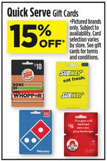 - Purchase gift cards to Wendy’s, Burger King, Subway, & Domino’s at a 15% discount at Dollar General.
