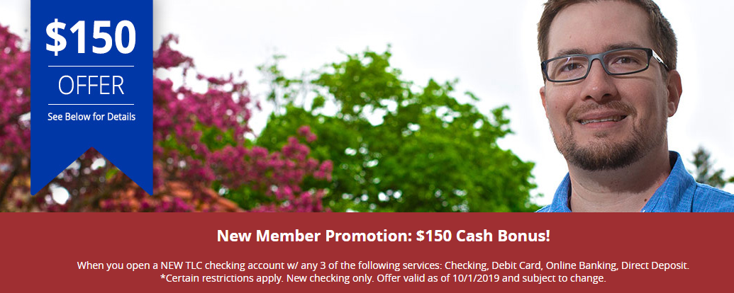 - TLC Community Credit Union is offering a bonus of $150 when you open a new TLC checking account with any three of the following services: