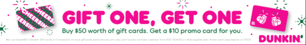 Dunkin’: Buy $50 in eGiftcards & Get Bonus $10 Promo Card December 14, 20207 Commentsby Chuck Contents1 The Offer2 The Fine Print3 Our Verdict The Offer Direct Link to offer Buy $50 in Dunkin’ e-gift cards from Cashstar and get a bonus $10 promo card. The Fine Print Minimum purchase of $50 in total Dunkin’ Gift Cards during one transaction on www.giftcards.dunkindonuts.com only. Limit 1 promo card per customer from 11/27-12/24/20 or while supplies lasts. Promo card value expires on 1/31/21. Our Verdict Easy little bonus for Dunkin customers. Hat tip to Dansdeals