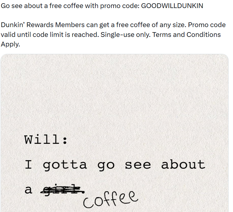 - Dunkin Donuts is offering a free coffee (any size) with promo code GOODWILLDUNKIN