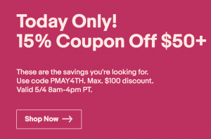 - Get 15% off sitewide at ebay.com on Friday, May 4 with promo code: PMAY4TH
