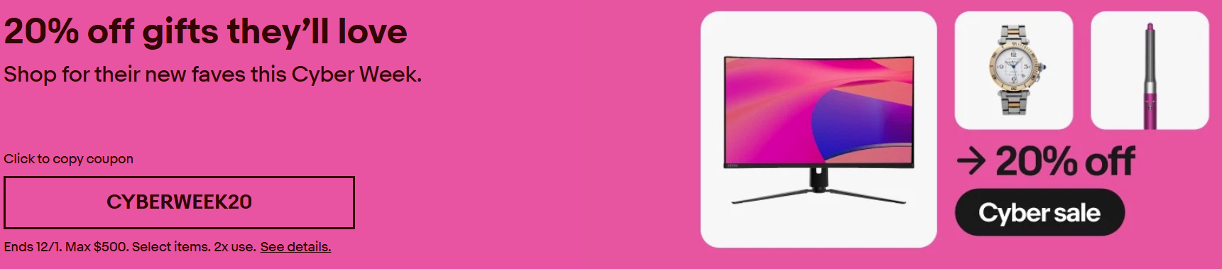 - eBay is offering 20% off select items with promo code Ends 12/1. Max $500. Select items. 2x use