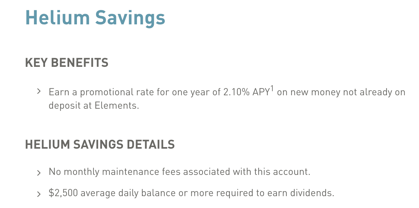 - Elements Financial is offering their Helium Savings accounts with a rate of 2.10% APY. Rate guaranteed for one year.