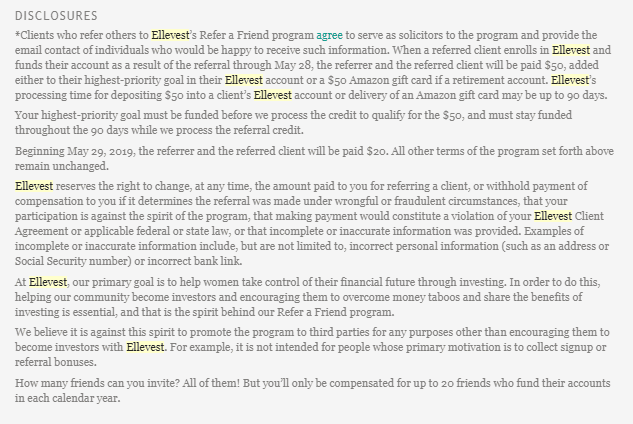 $50$20 when you signup through a referral link and fund your goal account (and keep it funded for at least 90 days)$50$20 for every referred friend who signs up and funds their account with Ellevest (maximum of 20 paid referrals)