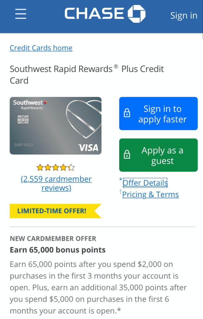 - Signup for the Southwest Rapid Rewards Plus card from Chase and get 65,000 bonus points after you spend $2,000 within the first 3 months.
