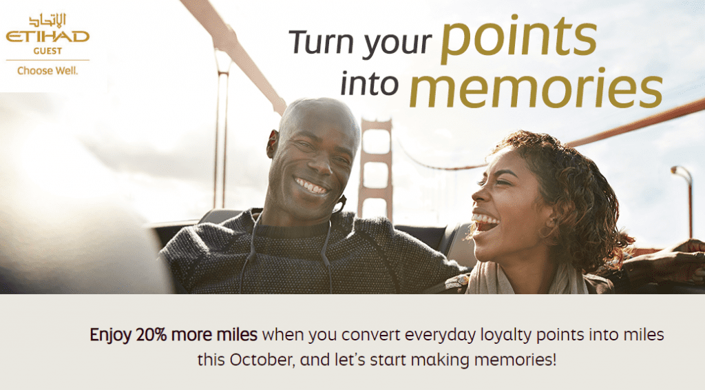 - Etihad is offering a 20% transfer bonus when you transfer hotel points to airline miles. The following partners are eligible: