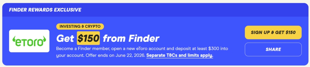 - Finder is offering a $150 Visa gift card when you open a eToro account while logged into Finder, deposit $300+ and keep that deposit in there until the fulfillment date.