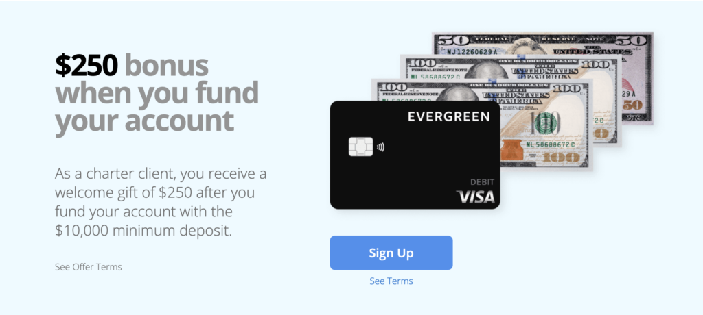 - Evergreen Money is offering a welcome gift of $250 after you fund your account with a $10,000 minimum deposit.