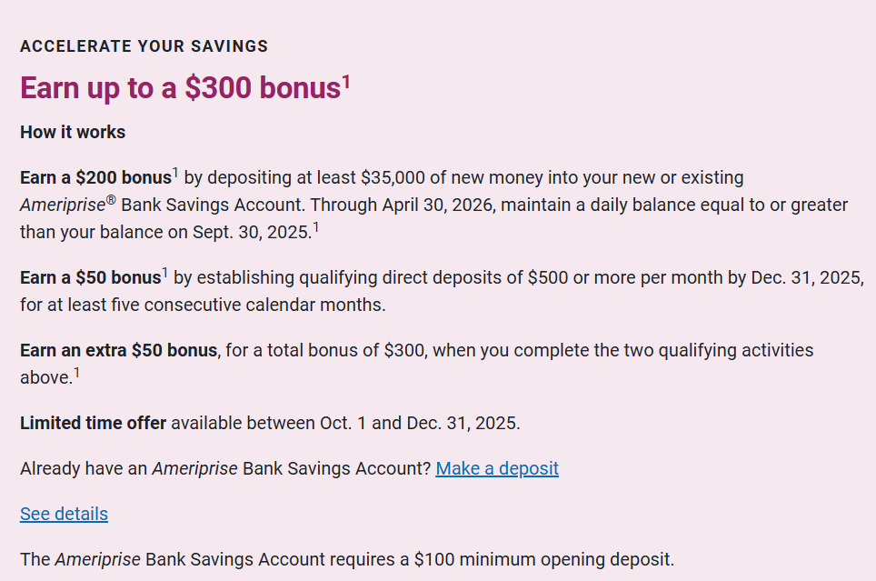 - $200 when you deposit at least $35,000 of new money into your new or existing Ameriprise® Bank Savings Account. Through April 30, 2026, maintain a daily balance equal to or greater than your balance on Sept. 30, 2025