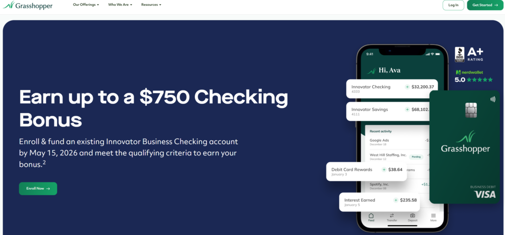 - Grasshopper Bank is offering a bonus of up to $750 when you enroll and fund an existing Innovator Business Checking account by May 15, 2026. Bonus you receive depends on the amount you fund your account with new money not currently held at Grasshopper Bank: