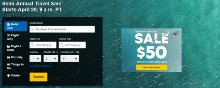 - This coupon code discount applies only to stand-alone hotel bookings (not a hotel booking in combination with any other product or offering such as flight + hotel or flight + hotel + car) made online at https://www.expedia.com that are prepaid at the time of booking.