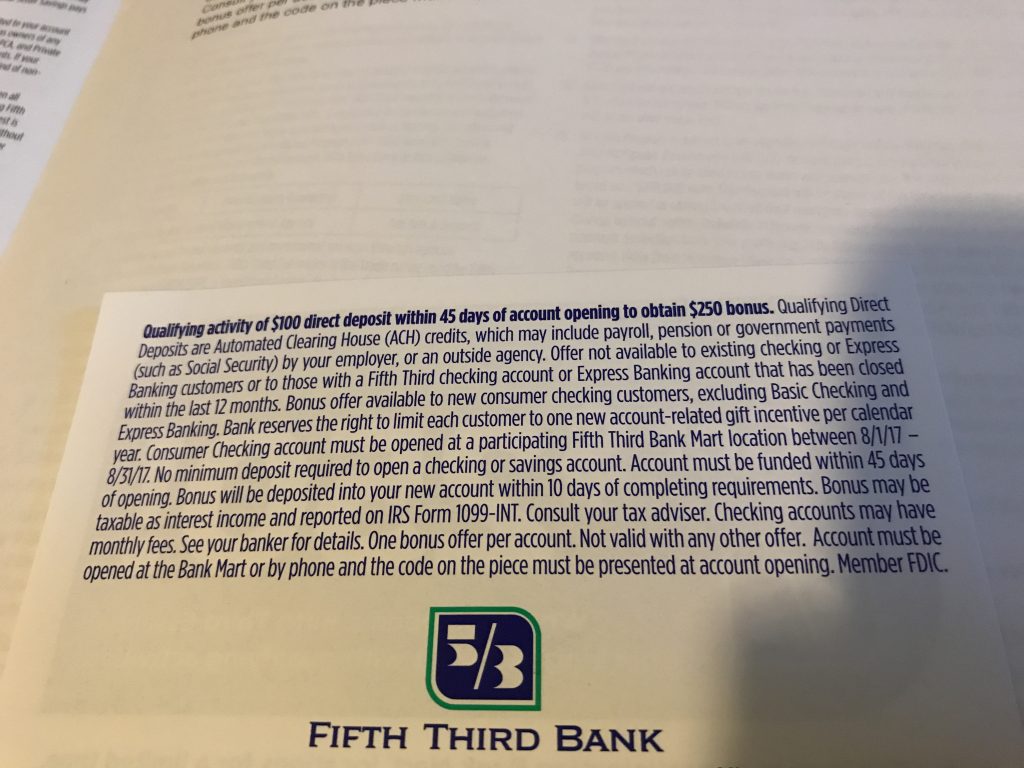 - Fifth Third is offering a $250 checking bonus when you open a new checking account at a Bank Mart location when you complete the following requirements: