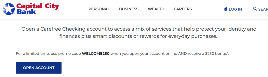- Capital City Bank is offering a $250 bonus when you open a new carefree checking account and complete the following requirements: