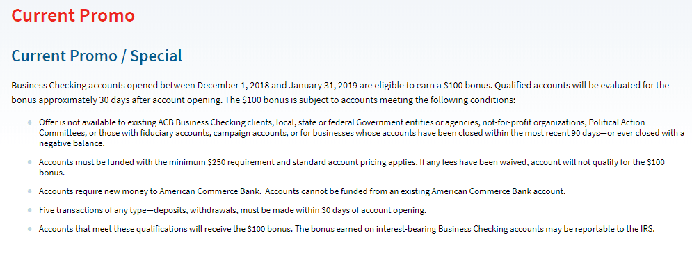 - American Commerce Bank is offering a bonus of $100 when you open a new business checking account and complete the following requirements: