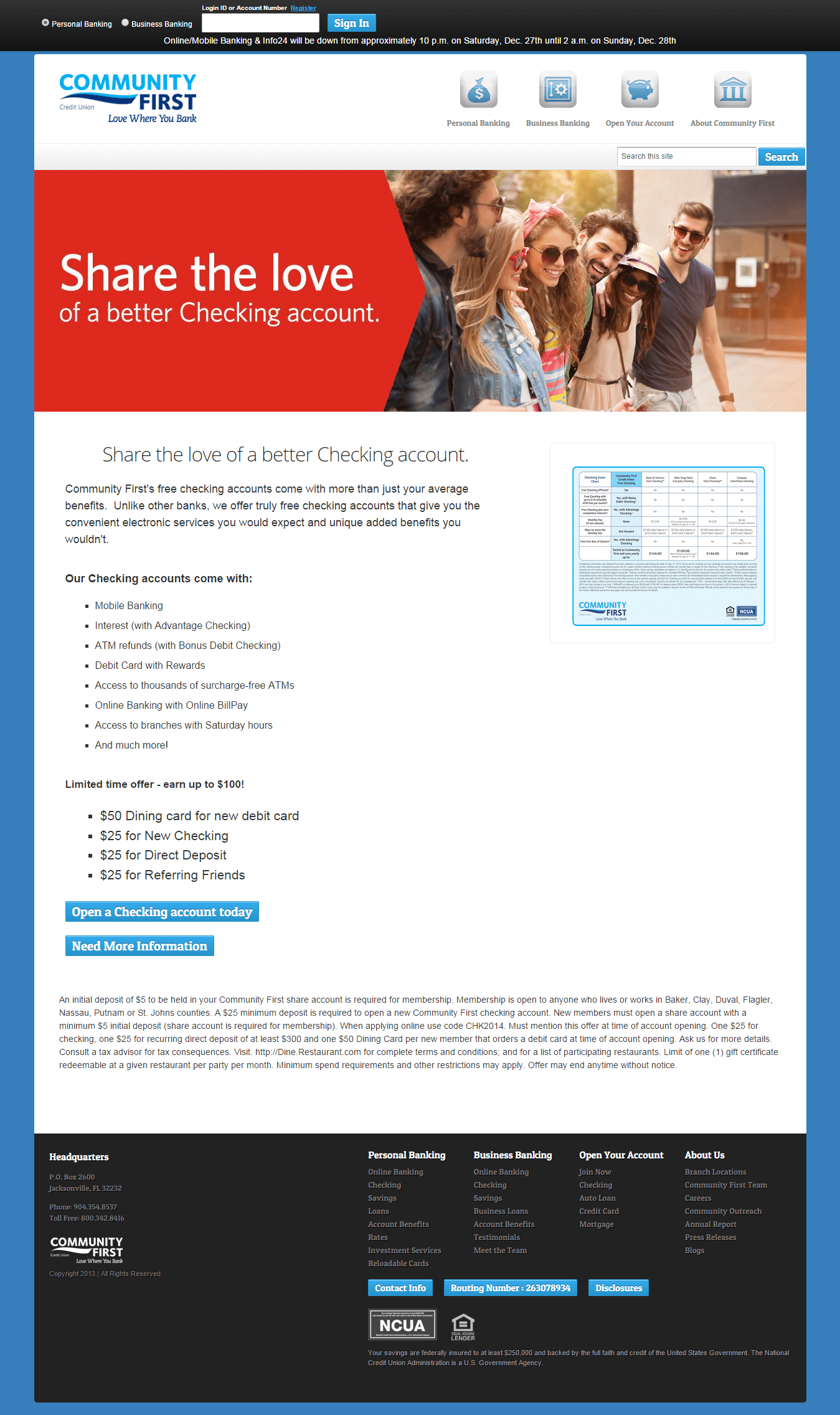 - Receive the following bonuses from Community First Credit Union of Florida when you use promotional code CHK2014, you must mention this offer at the time of opening.