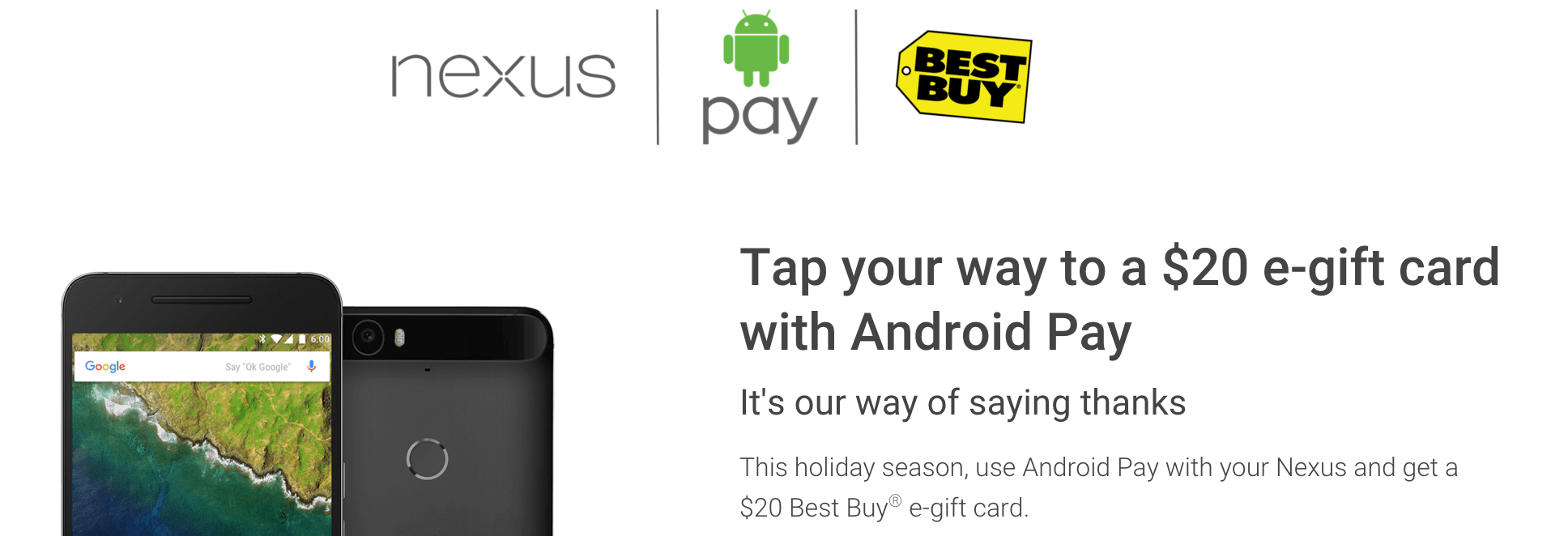 - Tap and pay using Android Pay on a Nexus phone before year’s end and receive a free $20 Best Buy e-gift card.
