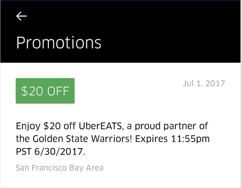 Anyone can add the promo code to the app, but it’ll only work for food orders in the San Francisco Bay Area. It’s a NBA championship celebration offer.