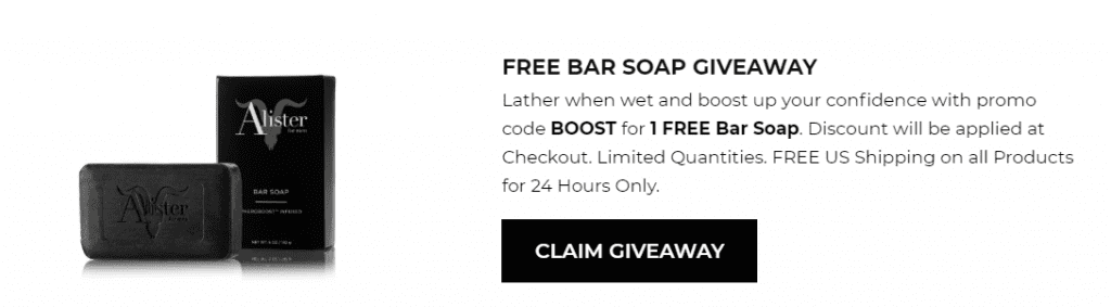 - Alister is giving away a free bar of soap, including delivery when you enter promo code BOOST