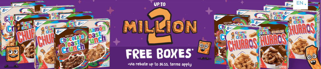- General Mills is offering a rebate of up to $6.55 via Paypal, Venmo or check: Buy an eligible size box of participating Cinnamon Toast Crunch cereals (see list below) at your local store or online between 9/1/21 – 9/30/21. Keep your receipt and/or email purchase confirmation.