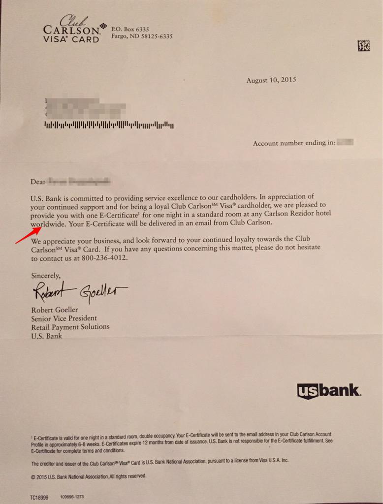 When Club Carlson removed the last night free benefit on the US Bank credit card, they also added a new benefit. It is supposed to be as follows: