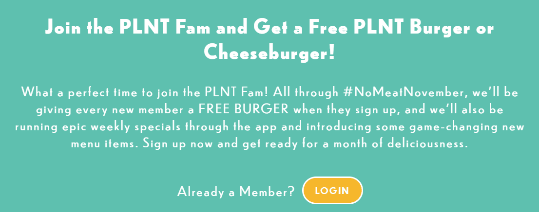 Free PLNT Burger or Cheeseburger With E-mail Signup November 9, 202214 Commentsby William Charles Contents1 The Offer2 Our Verdict The Offer Direct link to offer PLNT is offering a free PLNT burger or cheeseburger with e-mail sign up Our Verdict Free is free. Coupon is good for 15 days after entering e-mail.