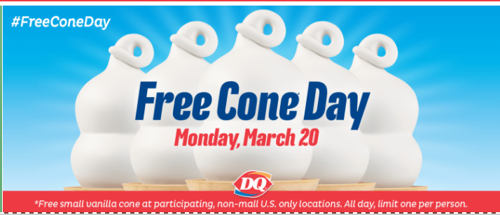 - Get a free vanilla ice cream cone at Dairy Queen locations