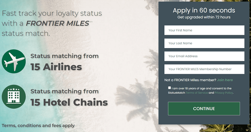 - In addition to other eligibility requirements, a status match will only be granted to applicant’s who’s name matches what exists in the Frontier Miles program.