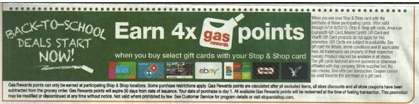 - Purchase select third-party merchant gift cards at Stop&Shop or Giant and receive 4x gas points on the purchase. 8/14/15-8/20/15.