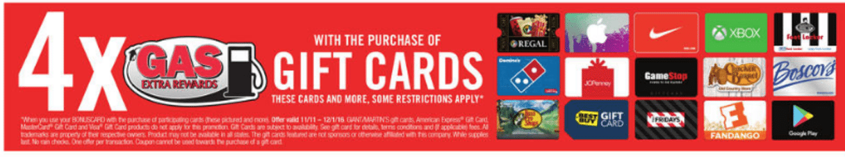 There are two offers going on at different Giant and S&S locations from November 11 through December 1, 2016. These offers are showing in the weekly circulars (should be page 6). Check your local store to see which deal they are running.