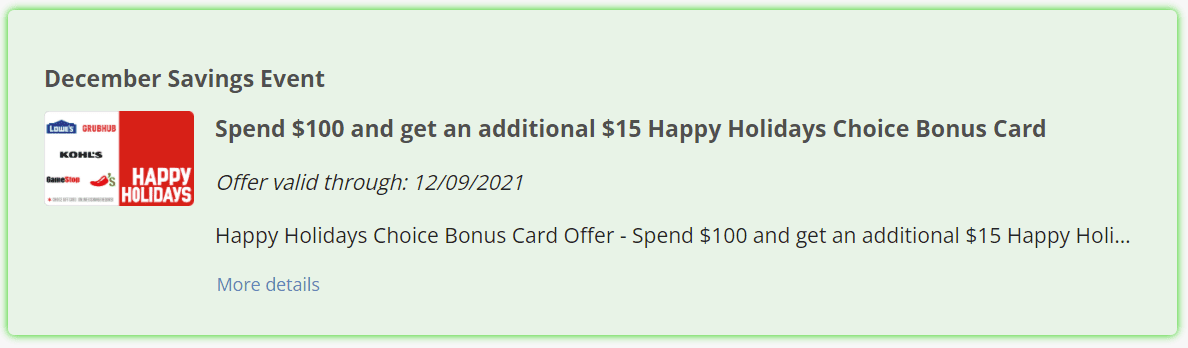 Giftcardmall.com: Purchase $100 Happy Holidays (Lowe’s & More) & Get $15 Bonus December 5, 20210 Commentsby William Charles Contents1 The Offer2 The Fine Print3 Our Verdict The Offer Direct link to offer Giftcardmall.com is offering a bonus $15 giftcard when you purchase a $100 Happy Holidays gift card The Fine Print 12/09/2021 Our Verdict Should stack with shopping portals as well.