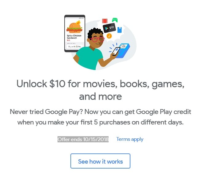 - Google is offering $10 in Google Play credit when you make your first 5 purchases using Google Pay on different days after opting in to this offer.