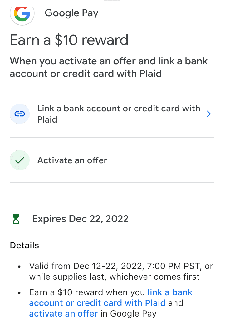 - Google Pay is offering some users a $10 reward when you activate an offer and link a bank account or credit card with plaid