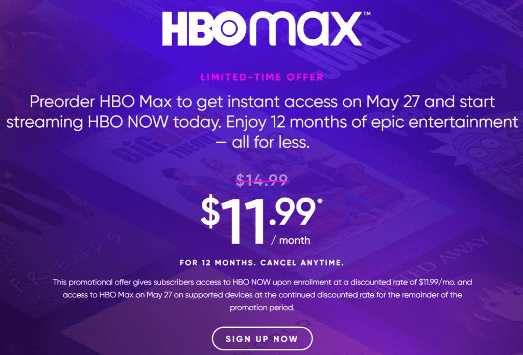 - Between April 30 at 9:00 pm ET and May 27 at 2:59 am ET, a limited number of subscriptions to this HBO NOW/HBO Max promotional offer are available at a discounted price of $11.99/mo.