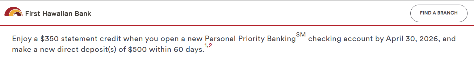 - First Hawaiian Bank is offering a bonus of $350 when you open a new Personal Priority Banking account and make a new new direct deposit(s) of $500 within 60 days