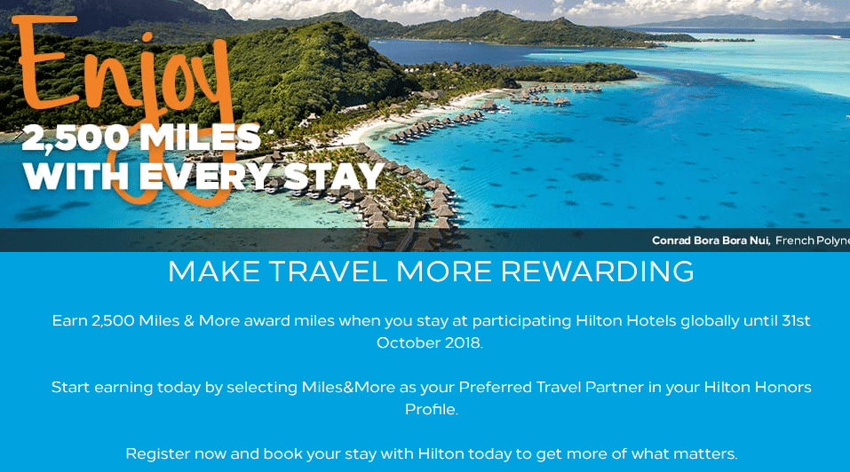 - Hilton is offering 2,500 Lufthansa miles per stay until October 31st, 2018. This stacks with other promotions: