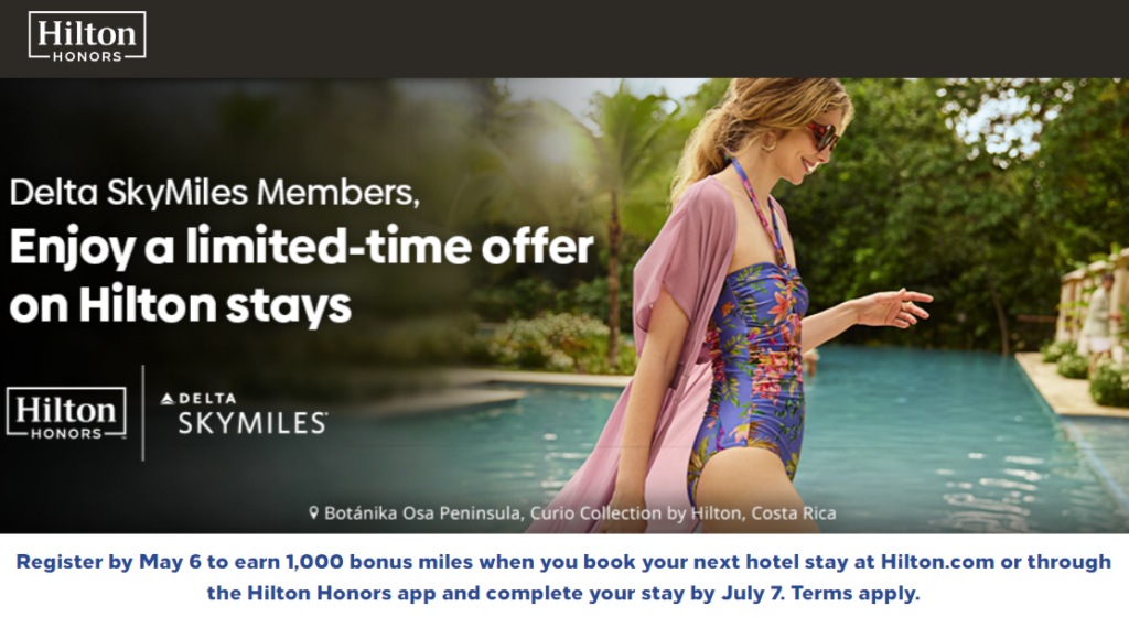 - Hilton is offering 1,000 Delta miles per stay when you register by May 6 and complete your stay by July 7