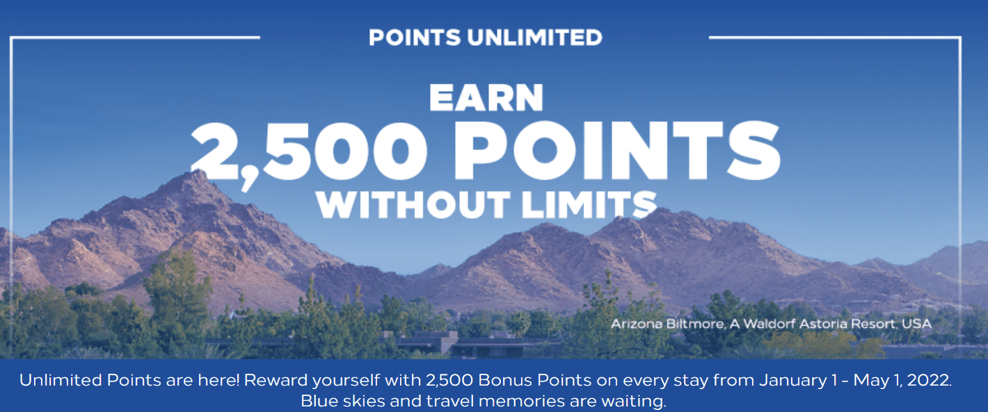 - Hilton is offering 2,500 bonus points per stay from January 1 – May 1, 2022