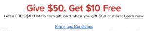- Hotels.com via Cashstar is offering a free $10 gift card when you buy $50 in gift cards.
